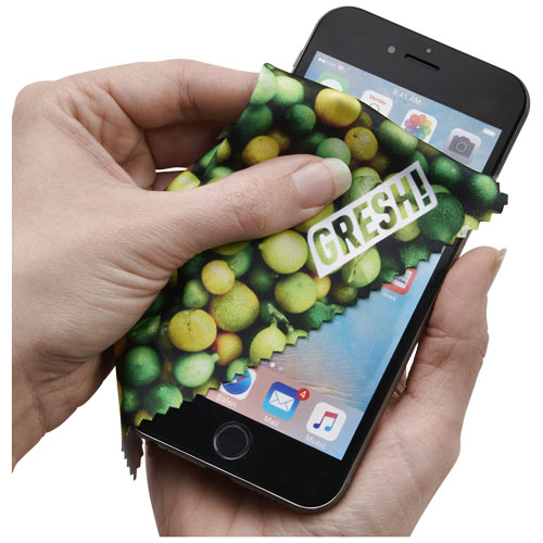 Panno di pulizia sublimato Caro, versione small. Disponibile con stampa full color su uno o due lati. Per stampa su due lati è possibile scegliere tra sublimazione standard o piazzata (piazzata significa che la stampa sarà allineata su entrambi i lati). Questo panno per la pulizia è facile da portare con voi e utile per pulire i vostri occhiali, touchscreen, cellulari o tablet.
