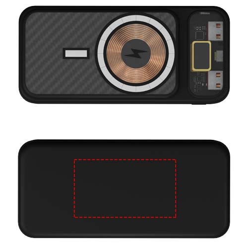 Power bank con capacità di 20.000 mAh, logo luminoso e tecnologia MagSafe, che consente di fissarlo magneticamente al retro di un telefono. La tecnologia di questo power bank è visibile grazie al rivestimento trasparente che mostra il circuito stampato all'interno. Dotato di display digitale della batteria e uscita/ingresso USB di tipo C. L'involucro è realizzato con un minimo del 50% di plastica riciclata. Se il tuo telefono non dispone della tecnologia MagSafe, puoi aggiungere l'adesivo magnetico sul retro per renderlo compatibile con il supporto magnetico. Dimensioni del power bank: 14,5 x 6,7 x 2,4 cm. Fornito in una confezione regalo in carta riciclata (18,8 x 8,48 x 3,8 cm) con chiusura magnetica. Garanzia di 3 anni inclusa.