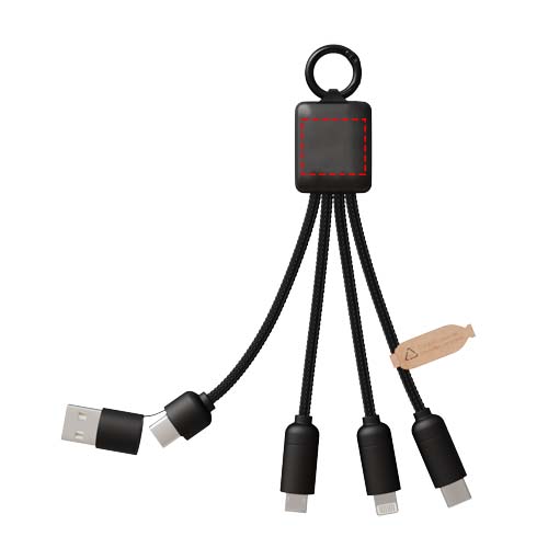Cavo di ricarica 5 in 1 con 3 connettori (Tipo C, Android, iPhone) e cavi in PET riciclato (realizzati con bottiglie di plastica riciclate). Grazie al doppio ingresso USB-A e USB-C, il cavo è compatibile al 100% con i computer più recenti presenti sul mercato (USB-C). Finitura effetto metallo sui tappi terminali. Con il cavo si possono caricare fino a 3 dispositivi contemporaneamente. Consegnato in una custodia in materiale riciclabile e una scheda in carta riciclata.