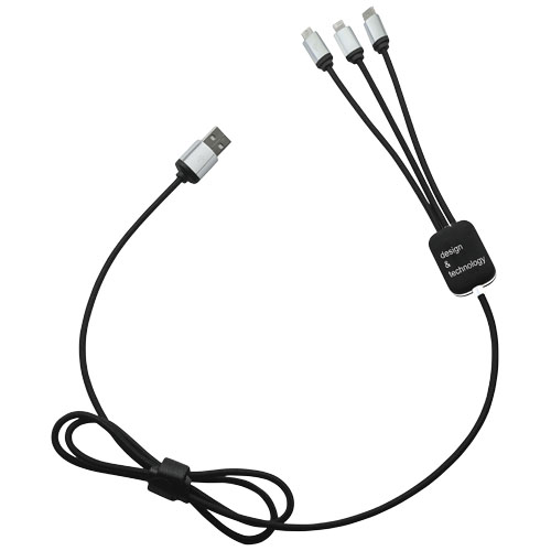 Cavo di ricarica con logo luminoso, finitura in gomma e dotato di tre connettori (tipo C, Android, iPhone). È possibile caricare fino a tre dispositivi contemporaneamente. Lunghezza dei cavi (spine incluse): 10 cm. Lunghezza totale del cavo: 1 metro. Cavo in plastica PET riciclata ed'imballaggio realizzato in carta e plastica riciclata.