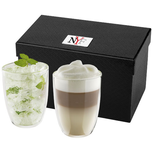 Set di bicchieri da 290 ml con isolamento a doppia parete. Ideale per servire latte macchiato, tè freddo o qualsiasi bevanda calda o fredda. Presentato in elegante confezione regalo. Placchetta per logo inclusa.