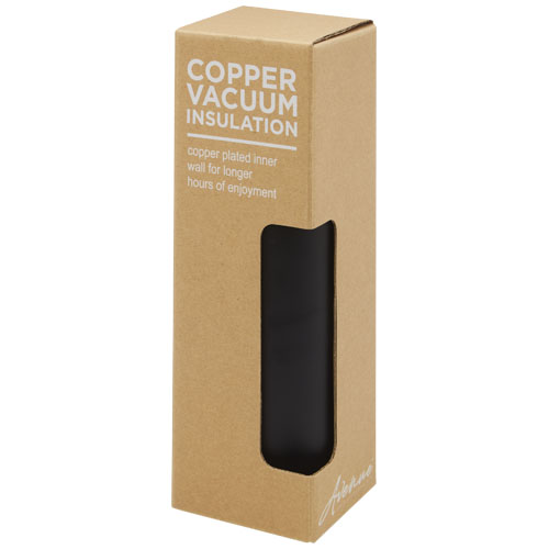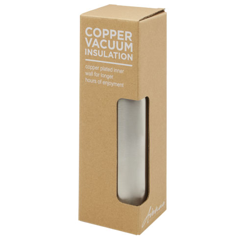 Borraccia termica in acciaio inox con isolamento sottovuoto in rame dal design classico ed elegante. Presenta un cinturino e dettagli sul tappo in finta pelle. Queste caratteristiche la rendono ideale per l'incisione laser, che metterà in evidenza il logo in argento creando un elegante effetto visivo. Grazie alla doppia parete in acciaio inossidabile 18/8 e in rame con isolamento sottovuoto, le bevande rimangono calde o fredde per diverse ore. Testata e approvata ai sensi della legislazione tedesca sulla sicurezza alimentare (LFGB) e testata per il contenuto di ftalati secondo il regolamento REACH. Capacità di 500 ml. Fornita in una confezione regalo in cartone riciclato.