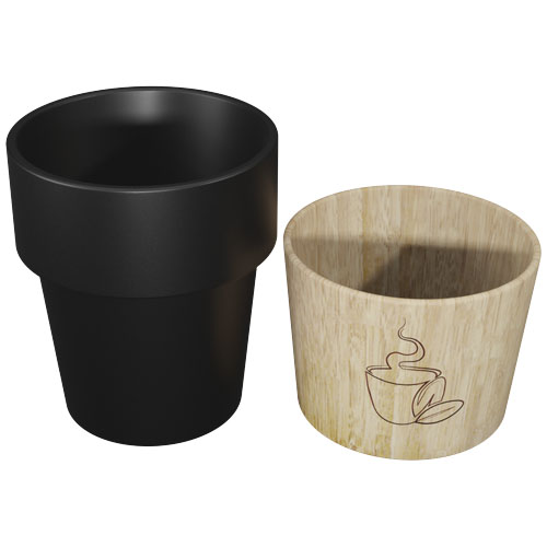 Set di 4 tazze in ceramica da 150 ml con base magnetica in legno, ideali per il caffè (corto o lungo). La tecnologia intelligente a magneti consente di staccare la base in legno dalla tazza in ceramica per pulirla in modo semplice. Le tazze in ceramica sono lavabili in lavastoviglie. Sono fornite in una confezione regalo in carta kraft riciclata con chiusura magnetica (34,5 x 12 x 9,5 cm). L'incisione laser sulla base in legno è un'opzione di stampa ecosostenibile.
