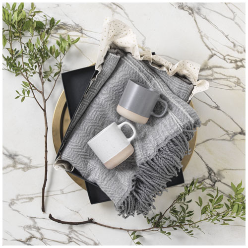 Tazza in ceramica con motivo a falò e fondo non smaltato. Lavabile in lavastoviglie in accordo alla normativa EN12875-1 (per almeno 125 cicli di lavaggio) per qualsiasi metodo di personalizzazione. Capacità di 360 ml. Presentata in una confezione regalo bianca.