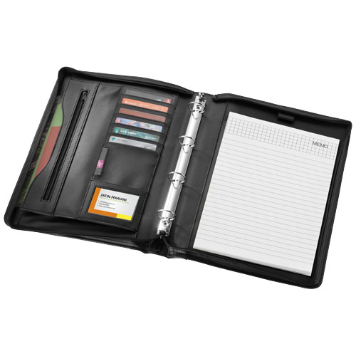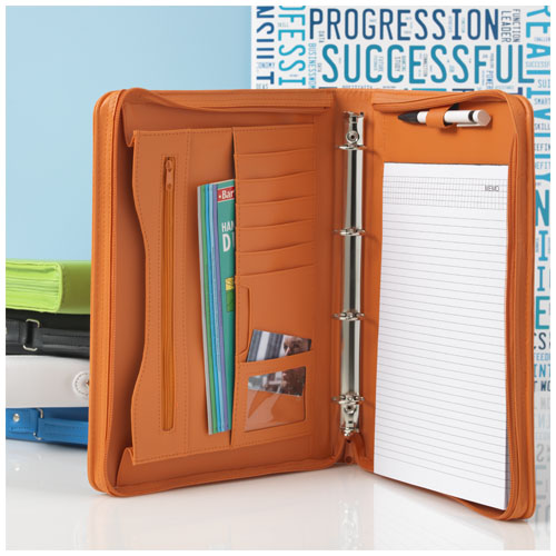 Cartellina con impugnatura, chiusura a zip, classificatore, tasca con zip e scomparti portadocumenti. Include un block notes a righe da 20 pagine. Penna e accessori non inclusi.