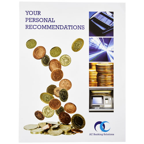 Portadocumenti e carte formato A4 da 350 g/m² con scomparto interno per biglietti da visita da 55 x 85 mm. Stampa full color disponibile su fronte, retro e all'interno del portadocumenti.