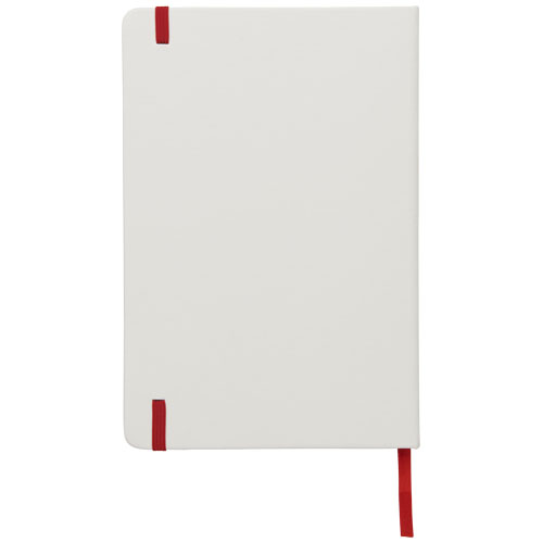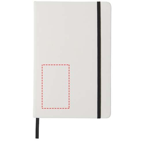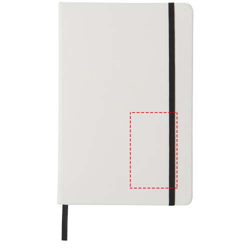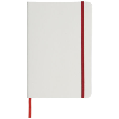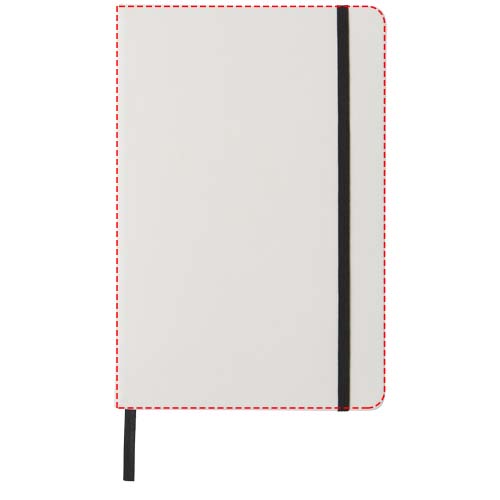 Notebook A5 bianco con chiusura elastica colorata e segnapagina coordinato. Composto da 80 pagine a righe (60g/m²). Stampa digitale disponibile per la copertina.