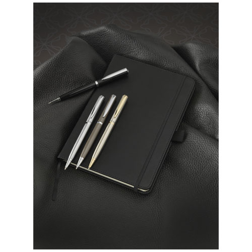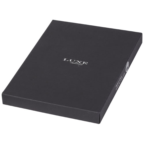 Taccuino con design esclusivo (formato A5) caratterizzato dalla carta da 80 g/m², 80 fogli a righe di color crema con tasca posteriore interna e porta penna. Confezionata in una scatola regalo "LUXE".