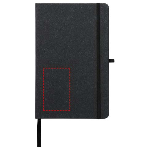 Taccuino di formato A5 con copertina realizzata con parti in pelle avanzate dal processo di lavorazione. Dispone di banda elastica, occhiello per penna, nastrino segnalibro e 80 fogli a righe di carta da 80 g/m².