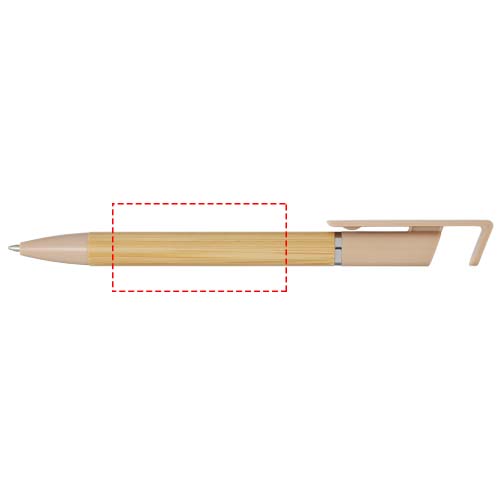 Penna a sfera in bambù che funge anche da supporto per smartphone. Il pulsante e l'anello centrale sono in plastica riciclata, la punta è in ottone e il fusto è in bambù proveniente da fonti responsabili. Colore dell'inchiostro: Nero. Capacità di scrittura: 1000 metri. Dimensione del pennino: 1,0 mm.