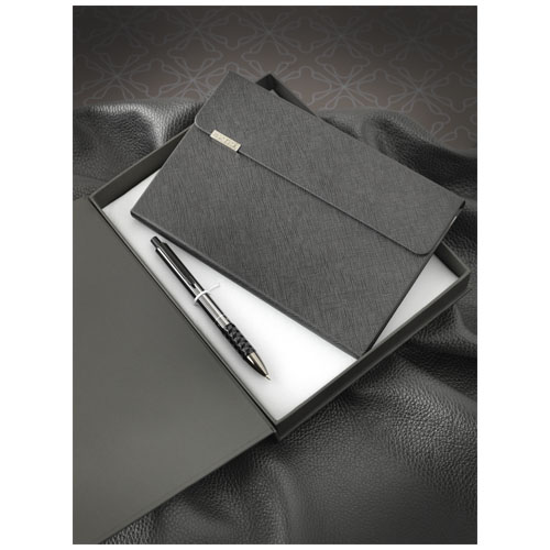 Taccuino dal design esclusivo (in formato A5) con copertina in TPU, nastro segna pagina di colore nero, chiusura magnetica e 80 fogli (80 g/m²) a righe di color crema. Accoppiato con la penna a sfera tattica a scatto. Entrambi gli articoli sono confezionati in una confezione regalo LUXE. Dimensioni del taccuino: 13,5 x 20,5 cm. Lunghezza della penna: 14 cm. Diametro della penna: 1,05 cm.