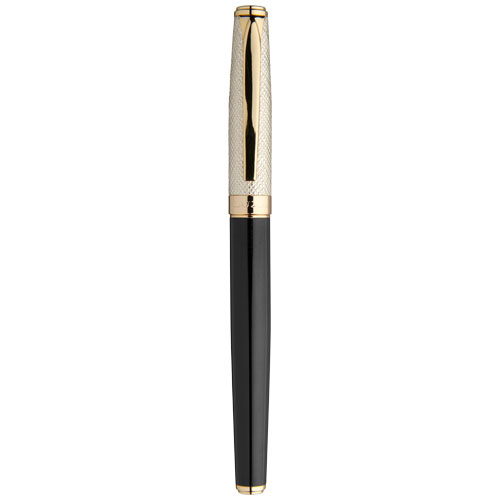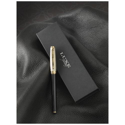 Una lussuosa penna roller, con tappo in pelle di color oro e parti laccate dorate, fornita in una confezione regalo Luxe. Il serbatoio inferiore è realizzato in ottone laccato e quello superiore in ottone e PU. Penna roller: 14 cm x 1,15 cm, peso: 32 g, capacità di scrittura: 500 m.