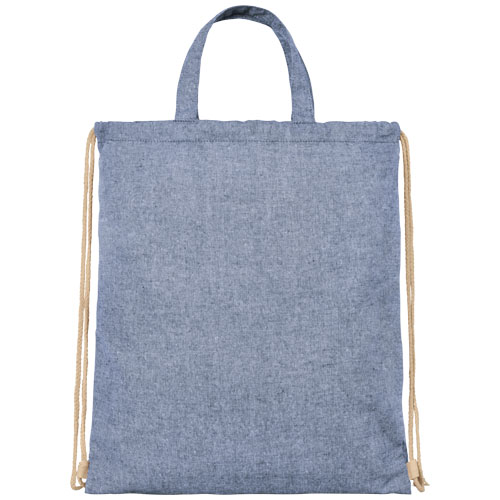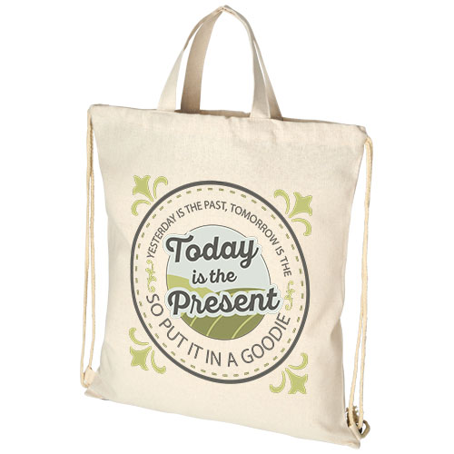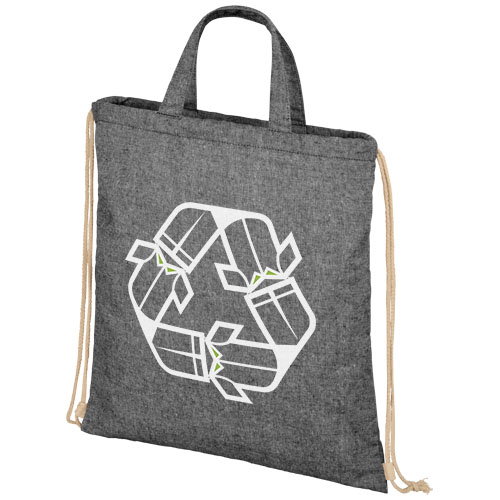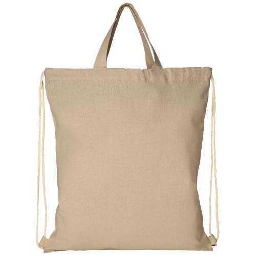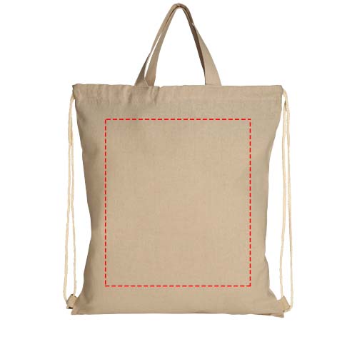 Zaino con cordoncino realizzato in tessuto riciclato da 210 g/m² composto da cotone e poliestere. Il cotone riciclato è prodotto da rifiuti pre-consumo generati dalle fabbriche tessili durante il processo di taglio. Ampio scomparto principale con chiusura con cordoncino in cotone. Dispone di due manici con un'altezza di 14 cm in estensione. Resistenza fino a 5 kg di peso. Sono possibili piccole variazioni di colore nel prodotto effettivo a causa della natura del processo di produzione.