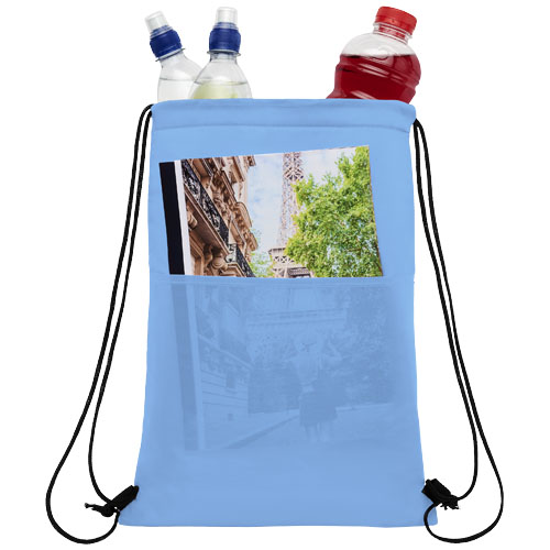 Borsa frigo con chiusura a coulisse di colore nero. Tasca anteriore aperta. Per 12 lattine. Resistenza fino a 5 kg di peso.