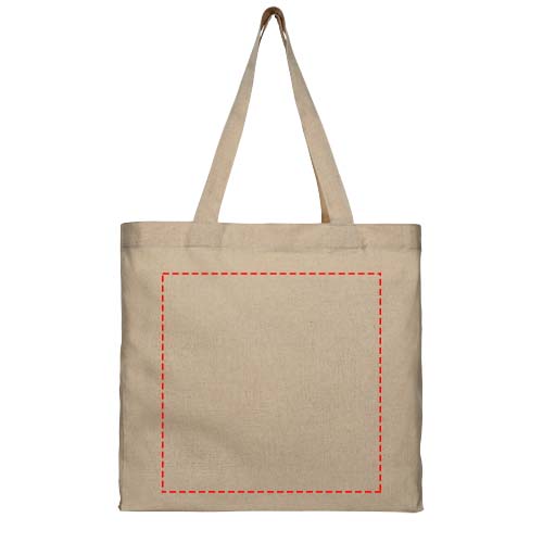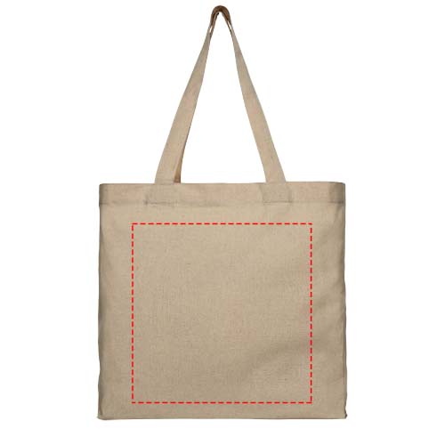 Tote bag realizzata in tessuto riciclato da 210 g/m² composto da cotone e poliestere. Il cotone riciclato è prodotto da rifiuti pre-consumo generati dalle fabbriche tessili durante il processo di taglio. Tote bag con fondo ampio e ampio scomparto principale. Dispone di due manici con un'altezza di 31 cm in estensione. Resistenza fino a 10 kg di peso. Sono possibili piccole variazioni di colore nel prodotto effettivo a causa della natura del processo di produzione.