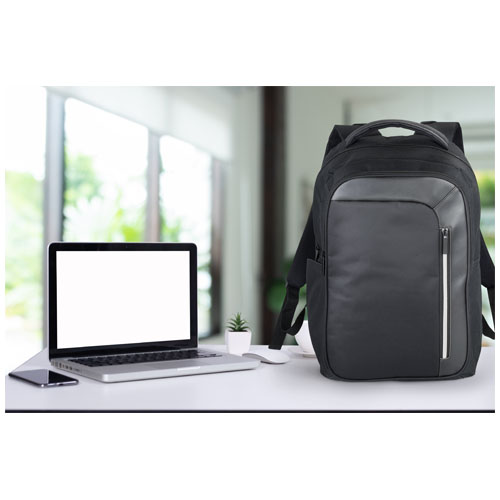 Zaino portacomputer 15" dal design contemporaneo ed elegante, con ampia tasca frontale con zip con portachiavi e tecnologia RFID per proteggere le vostre carte di credito e passaporti dai furti di identità. L'ampio scomparto principale con zip può contenere un portatile misura 15" ed è dotato anche di scomparto separato imbottito per iPad o tablet. La tasca frontale verticale con zip vi permette di tenere piccoli oggetti a portata di mano. Due tasche laterali aggiuntive, spallacci imbottiti e regolabili con inserti in fettuccia. Maniglia superiore e fascia per agganciarlo al trolley. Sono possibili piccole variazioni di colore nel prodotto effettivo a causa della natura dei coloranti dei tessuti, delle trame e della stampa.