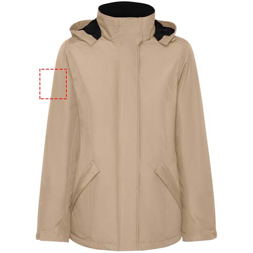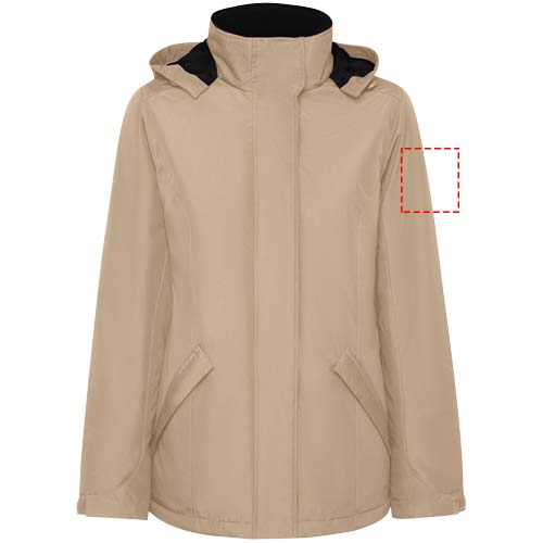 Giacca parka impermeabile imbottita da donna. Aderente. Collo alto con cappuccio ripiegabile e rimovibile con chiusura a strappo. Zip centrale abbinata con pattina. Tasche laterali con zip e pattina fissa. Tasca interna con chiusura a strappo. Polsini regolabili con passante a strappo. Accesso interno per rinforzi sul retro e sul petto a sinistra.