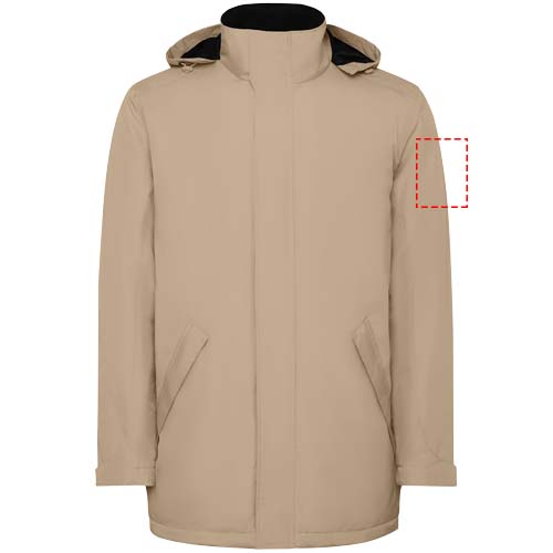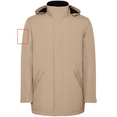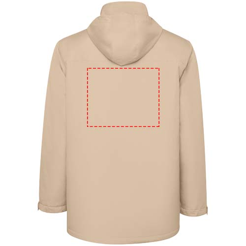 Giacca parka impermeabile imbottita da uomo. Collo alto con cappuccio ripiegabile e rimovibile con chiusura a strappo. Zip centrale abbinata con pattina. Tasche laterali con zip e pattina fissa. Tasca interna con chiusura a strappo. Polsini regolabili con passante a strappo. Accesso interno per rinforzi sul retro e sul petto a sinistra.