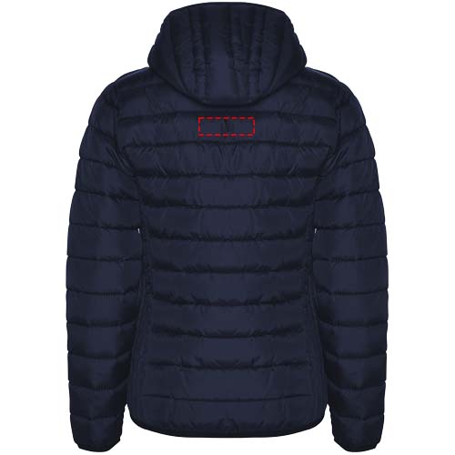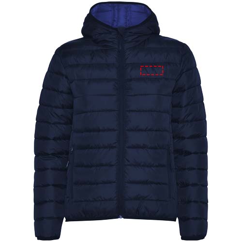 Giacca da donna trapuntata morbida al tatto e cappuccio regolabile. Cerniere invertite con protezione per il mento abbinata. Due tasche anteriori con cerniera. Orlo elasticizzato abbinato sui polsini, sull’orlo e sul cappuccio. Fodera interna a contrasto. Inclusa borsa per riporta e trasportarla. Indumento leggero e ripiegabile. Idrorepellente. Modello anti-vento.
