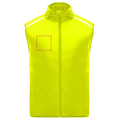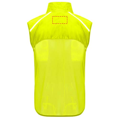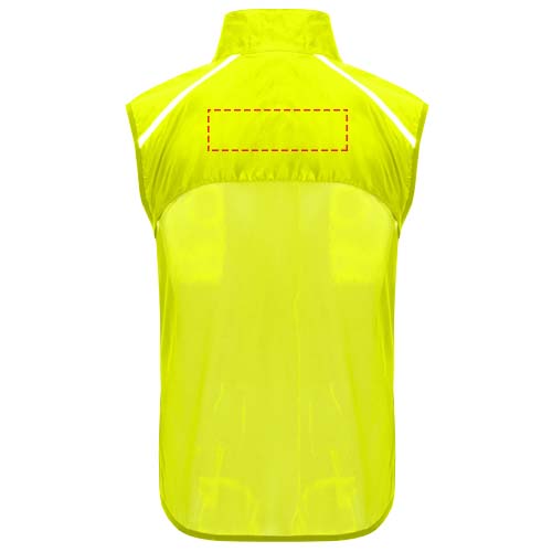Antivento e traspirante. Zip anteriore con protezione per il mento abbinata. Orlo elasticizzato sul giromanica e sulla parte inferiore. Parte inferiore del retro in tessuto microforato. Dettagli fluorescenti sulla parte superiore, anteriore e posteriore. Tasca con fascia elastica per riporre il gilet e da indossare al polso. Etichetta rimovibile.
