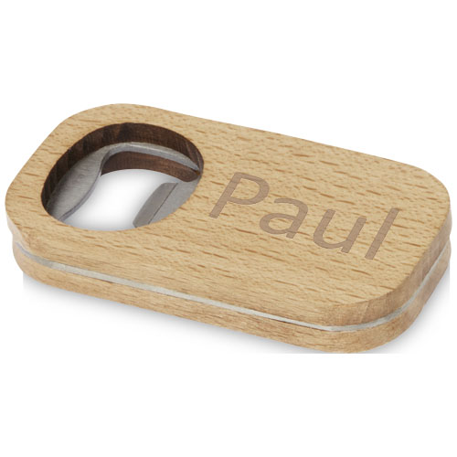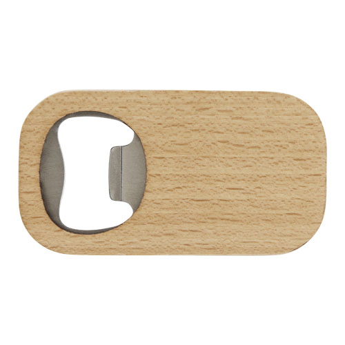Apribottiglie in acciaio inossidabile con superficie in legno.