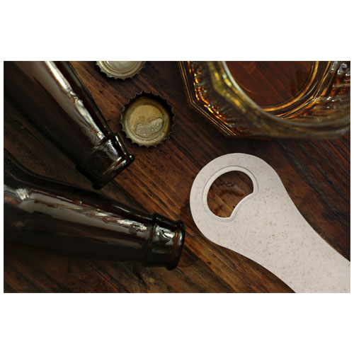 Apribottiglie in paglia di grano per aprire le bottiglie di birra, le bevande analcoliche, ecc. La paglia di grano è lo stelo che rimane dopo la raccolta dei chicchi di grano ed è un materiale che consente di ridurre la quantità di plastica utilizzata.