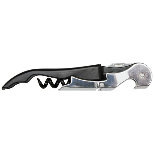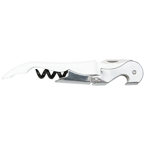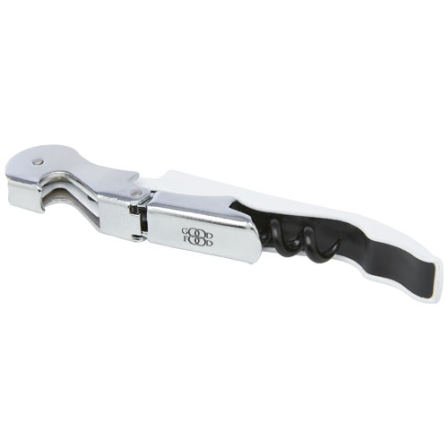 Coltellino da cameriere in acciaio inossidabile con corpo colorato e dotato di cavatappi, tagliacapsule e apribottiglie. Grazie alla struttura in due fasi, rimuove facilmente il tappo della bottiglia.