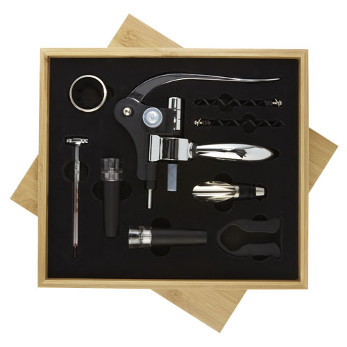 Set per vino composto da 9 pezzi con 1 cavatappi, 2 tappi, 1 versatore, 1 anello, 1 tagliacapsule, 1 termometro e 2 ricambi per cavatappi. Fornito in una confezione regalo in bambù di provenienza e produzione secondo standard sostenibili.