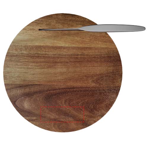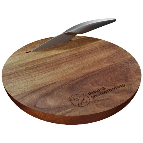 Esclusivo tagliere in legno di acacia e set di coltelli in acciaio inox. Prodotto personalizzabile con logo inciso. Il tagliere (diametro 30 cm con altezza 4 cm) è stato progettato con un inserto (30,4 x 4 x 2 cm) in cui riporre il coltello dopo l'uso. Entrambi i prodotti sono forniti in una confezione regalo in carta riciclata (36,8 x 33,5 x 5,1 cm) con chiusura magnetica. Garanzia di 3 anni inclusa.