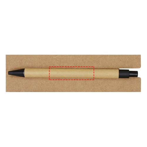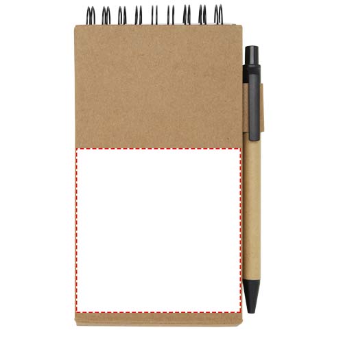 Blocchetto con foglietti adesivi e penna a sfera. Il blocchetto è dotato di 30 fogli di carta bianca da 70 g/m² (8 x 12 cm). Dispone inoltre di 25 foglietti adesivi multicolore (5 x 1,2 cm) e 25 gialli (7,5 x 7,5 cm), entrambi in carta da 70 g/m². Il fusto della penna a sfera è realizzato in carta riciclata. Colore dell'inchiostro: Nero. Capacità di scrittura: 1000 metri. Dimensione del pennino: 1,00 mm.
