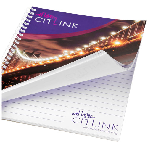 Blocco note spiralato di formato A4 Desk-Mate®. Questo blocco note include una spirale bianca o nera, una copertina frontale in carta lucida (250 g/m2) e carta bianca (80 g/m2). La versione standard include 50 fogli, disponibile inoltre in versione da 80 fogli. Puoi personalizzare le pagine di questo versatile blocco note con qualsiasi design - sia che tu voglia fogli a righe, a quadretti o puntinati - tutto è possibile!