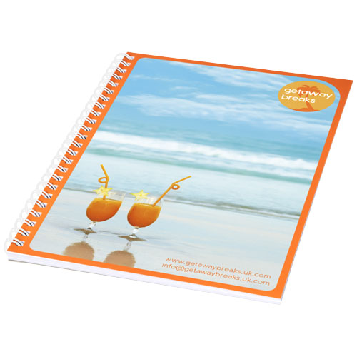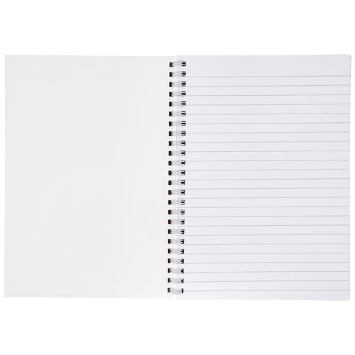 Blocco note spiralato Desk-Mate® di formato A5. Include 50 fogli di carta bianca (80 g/m²) ed una copertina frontale (450 g/m²). La copertina è impermeabile. Puoi personalizzare le pagine di questo versatile blocco note con qualsiasi design - sia che tu voglia fogli a righe, a quadretti o puntinati - tutto è possibile!
