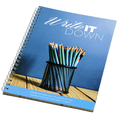 Blocco note spiralato di formato A5 Desk-Mate®. Questo blocco note include una spirale bianca o nera, una copertina frontale in carta lucida (250 g/m2) e carta bianca (80 g/m2). La versione standard include 50 fogli, disponibile inoltre in versione da 80 fogli. Puoi personalizzare le pagine di questo versatile blocco note con qualsiasi design - sia che tu voglia fogli a righe, a quadretti o puntinati - tutto è possibile!
