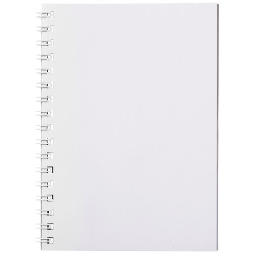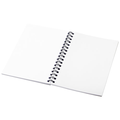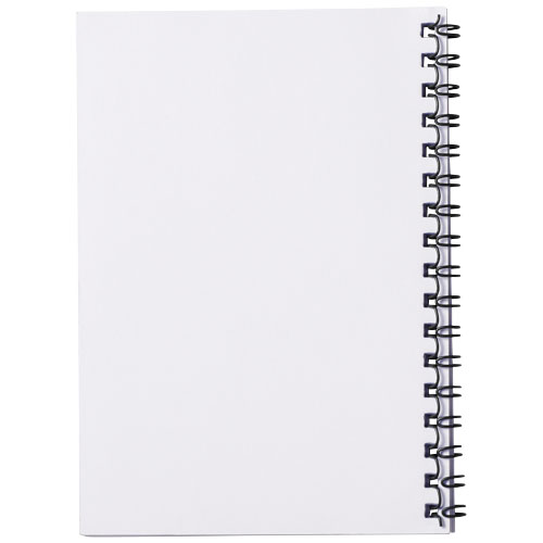 Blocco note spiralato di formato A6 Desk-Mate®. Include 50 fogli di carta bianca da 80 g/m2, una copertina frontale in carta lucida (250 g/m²) ed una sovra copertina da 450 micron in polipropilene trasparente. Spirale nera o bianca. Puoi personalizzare le pagine di questo versatile blocco note con qualsiasi design - sia che tu voglia fogli a righe, a quadretti o puntinati - tutto è possibile!