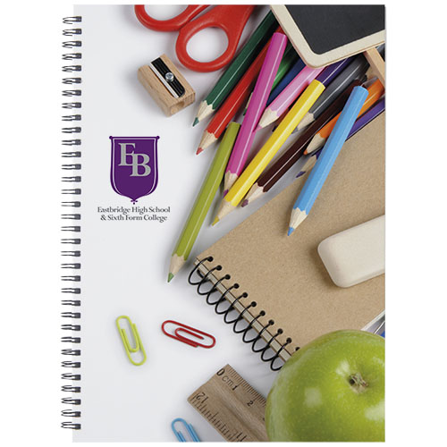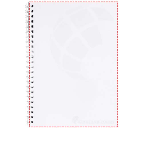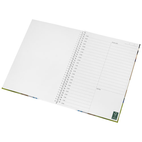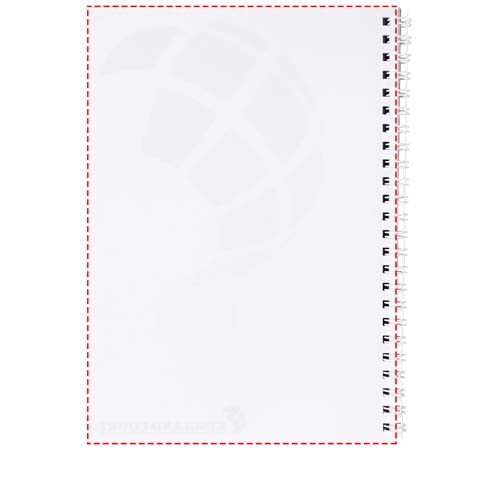 Include 80 fogli di carta in bianco (da 80 g/m²) e spirale nera o bianca. Disponibile in 3 misure; A4, A5 e A6. Disponibile decorazione a colori CMYK sulla copertina e su ogni foglio, davanti e dietro.
