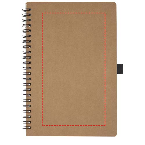 Quaderno formato A5 con copertina in cartone riciclato, rilegatura a spirale e asola portapenna. Contiene 70 fogli da 60 g/m² con pagine interne rivestite in pietra. La carta di pietra è 100% tree-free e il processo di produzione consuma meno energia rispetto alla carta da polpa di cellulosa nuova o riciclata. La carta è resistente all'acqua e agli strappi e ha un colore bianco naturale (senza uso di sbiancanti).