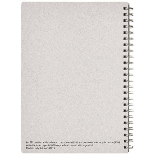 Quaderno formato A5 con rilegatura a spirale e copertina realizzata con materiali da fonti responsabili contenente scarti di lavorazione del cotone (15%) e fibre riciclate post consumo (40%). Include 80 fogli puntinati di carta riciclata al 100% da fonti responsabili da 80 g/m2. Il layout puntinato combina i vantaggi delle pagine a righe, bianche e di quelle a quadretti, fornendo una struttura e stimolando allo stesso tempo la creatività, aspetto che rende questo quaderno adatto per una vasta tipologia di utenti. Grazie alla spirale, il quaderno può rimanere comodamente aperto in piano e si può chiudere facilmente. Realizzato in Italia.