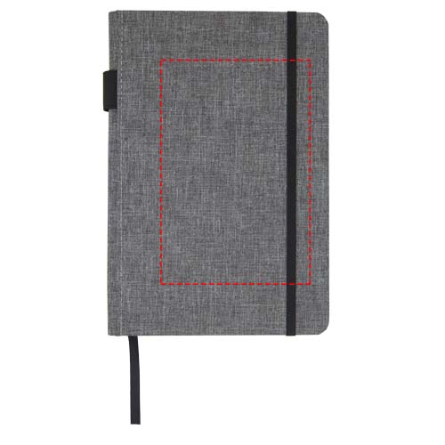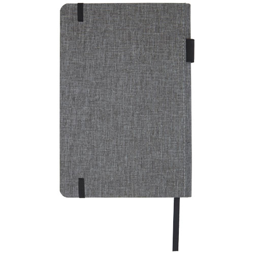 Quaderno formato A5 con coperchio in tessuto PET riciclato. Contiene 96 fogli di carta riciclata da 70 g/m² con layout foderato, asola portapenna e nastro segnalibro. Custodia di cartone.