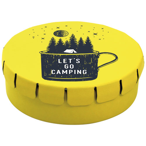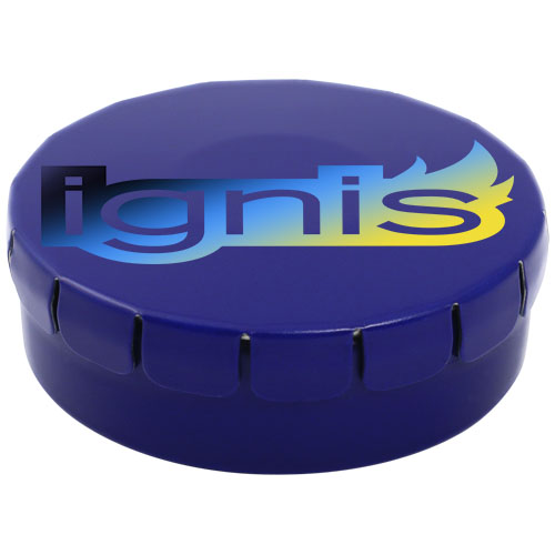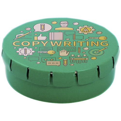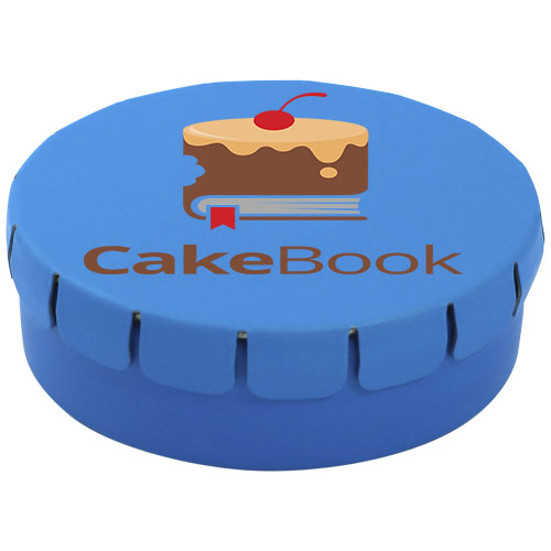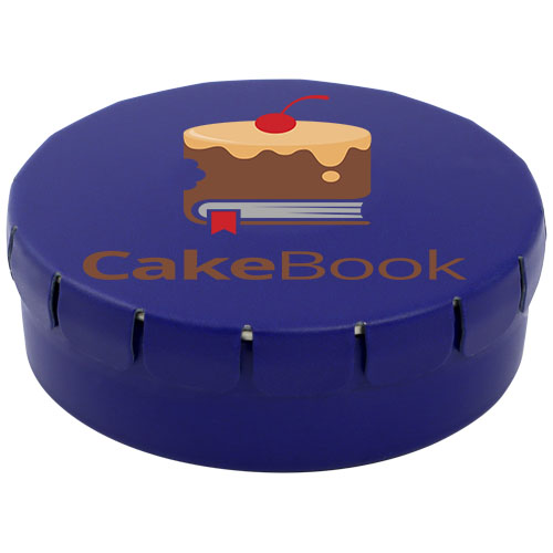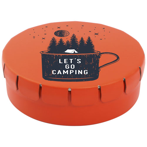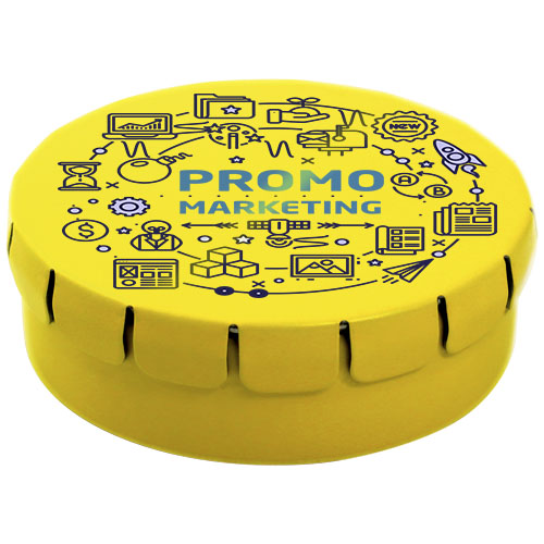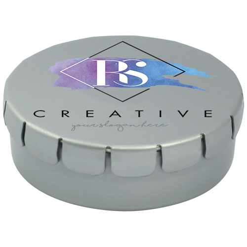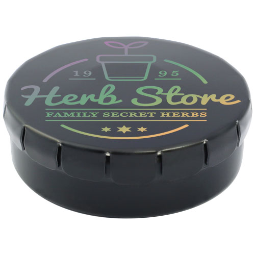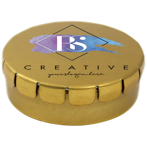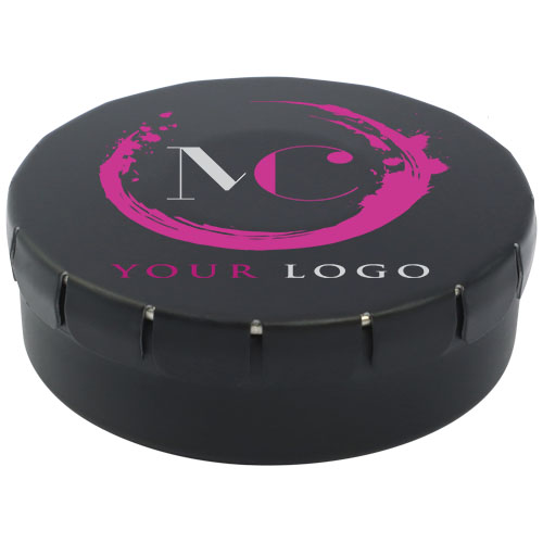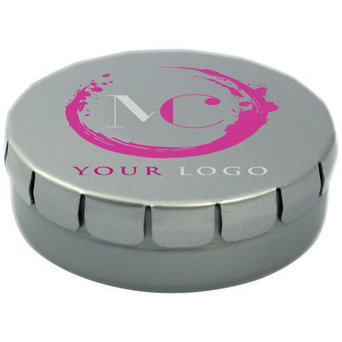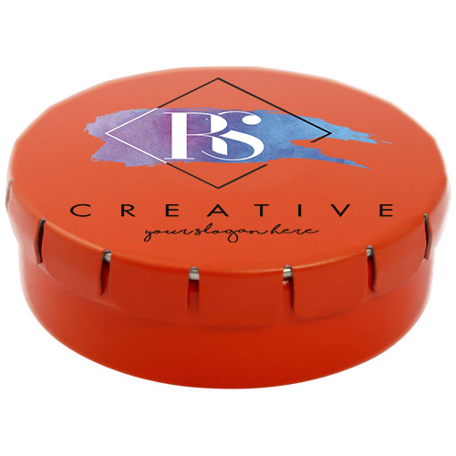 Caramelle a forma di cuore e alla fragola in contenitore di latta con facile apertura a scatto. Il contenitore può essere ordinato in una vasta gamma di colori e riempito con caramelle dai gusti diversi: mentine tradizionali, mentine extra forti, mentine senza zucchero, gelatine di frutta, caramelle a forma di cuore e al gusto fragola, cannella, caramelle al limone e menta o cioccolatini. Il coperchio può essere decorato con una stampa digitale a colori.