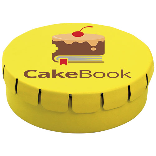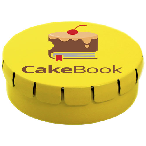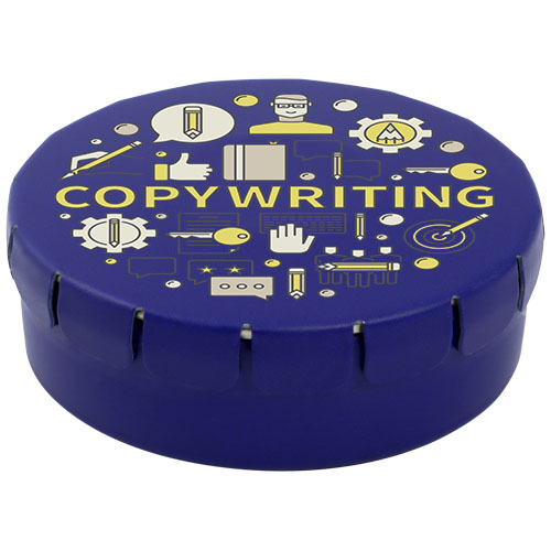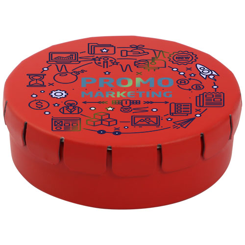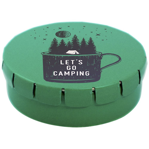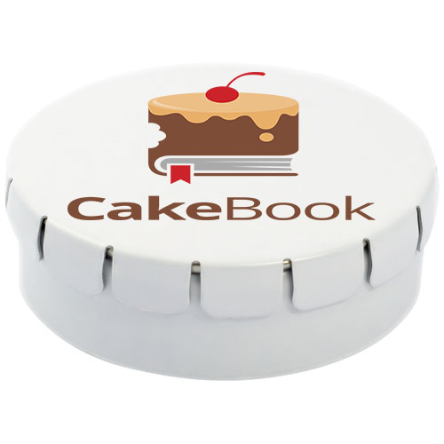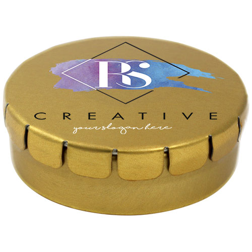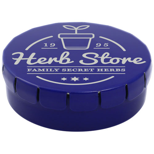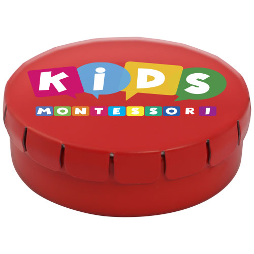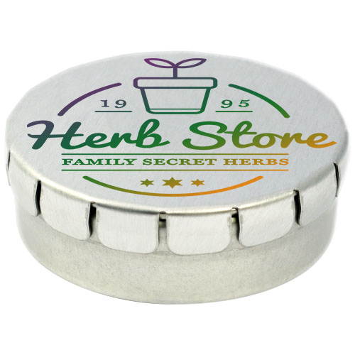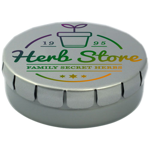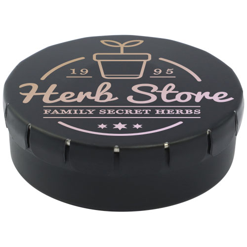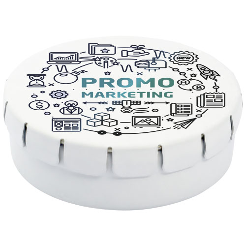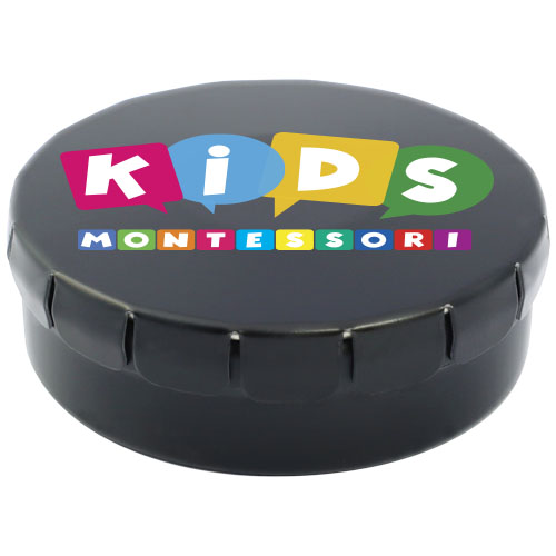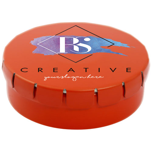 Caramelle al gusto di limone e menta in contenitore di latta con facile apertura a scatto. Il contenitore può essere ordinato in una vasta gamma di colori e riempito con caramelle dai gusti diversi: mentine tradizionali, mentine extra forti, mentine senza zucchero, gelatine di frutta, caramelle a forma di cuore e al gusto fragola, cannella, caramelle al limone e menta o cioccolatini. Il coperchio può essere decorato con una stampa digitale a colori.