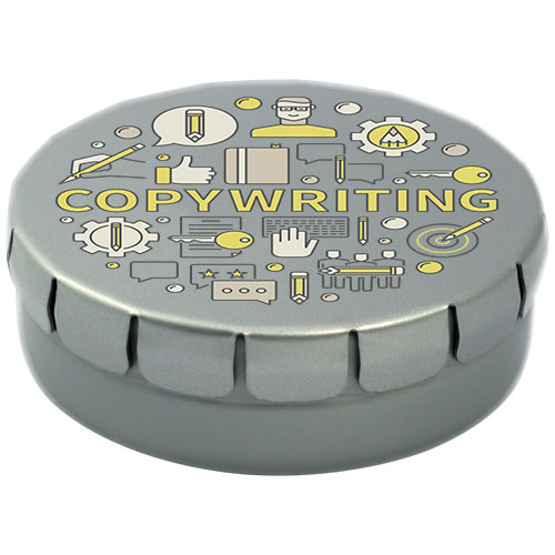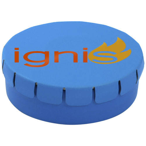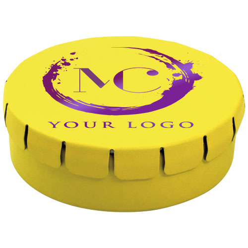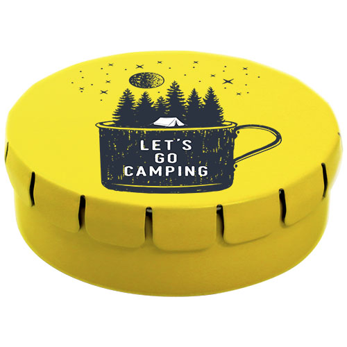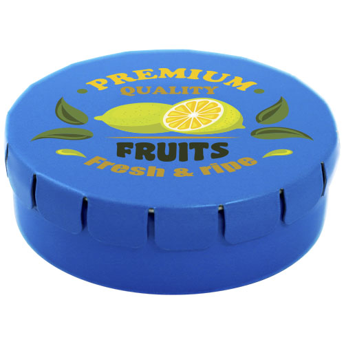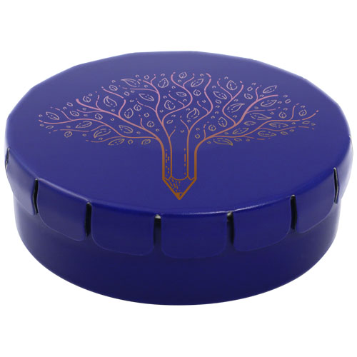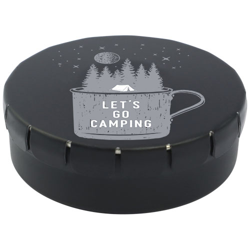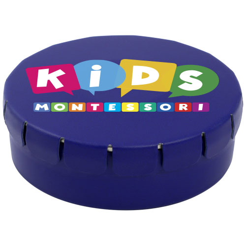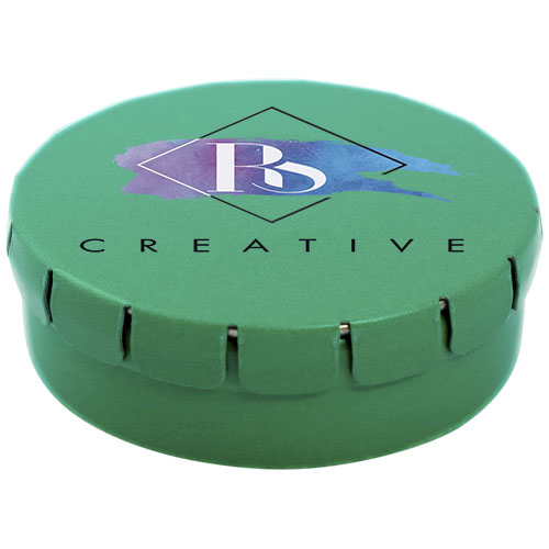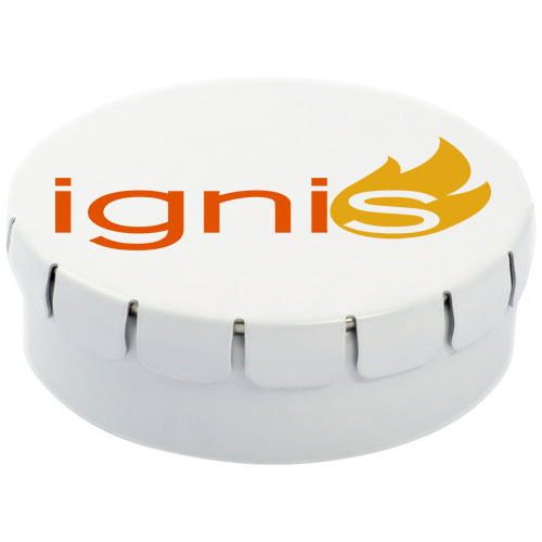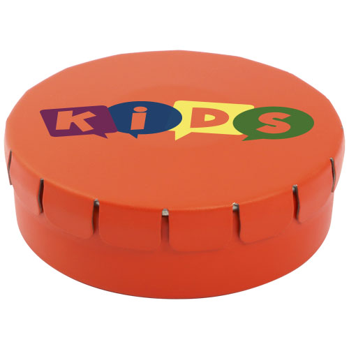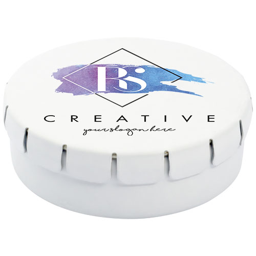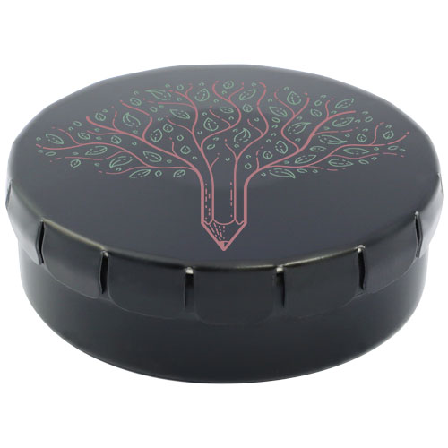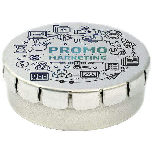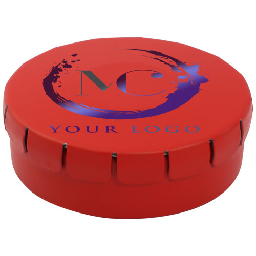 Caramelle al gusto cannella in contenitore di latta con facile apertura a scatto. Il contenitore può essere ordinato in una vasta gamma di colori e riempito con caramelle dai gusti diversi: mentine tradizionali, mentine extra forti, mentine senza zucchero, gelatine di frutta, caramelle a forma di cuore e al gusto fragola, cannella, caramelle al limone e menta o cioccolatini. Il coperchio può essere decorato con una stampa digitale a colori.