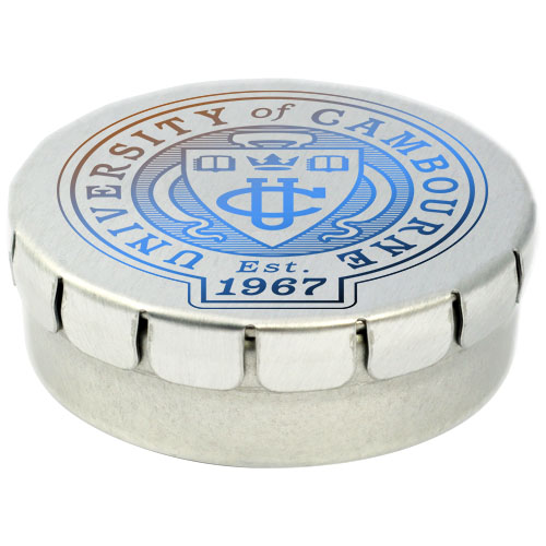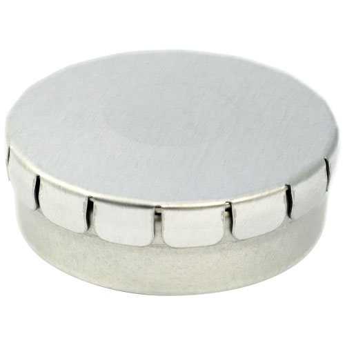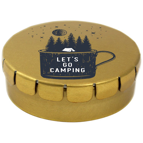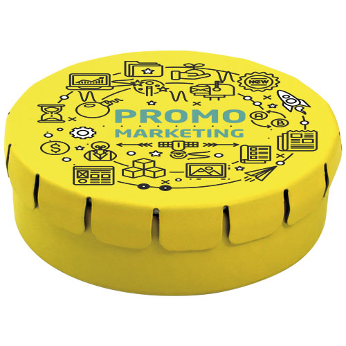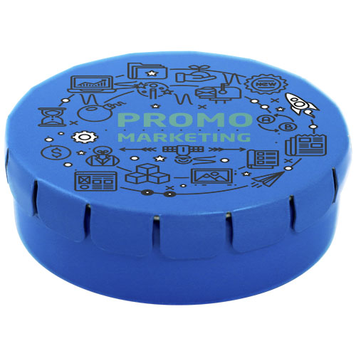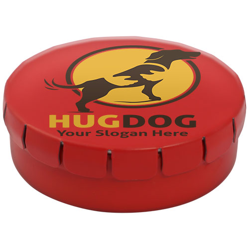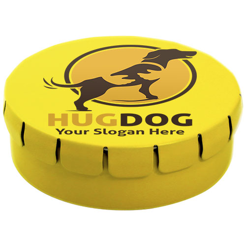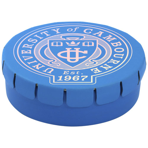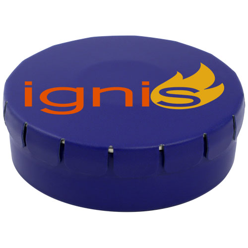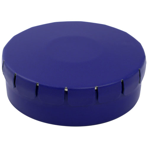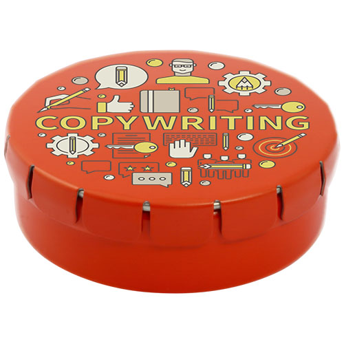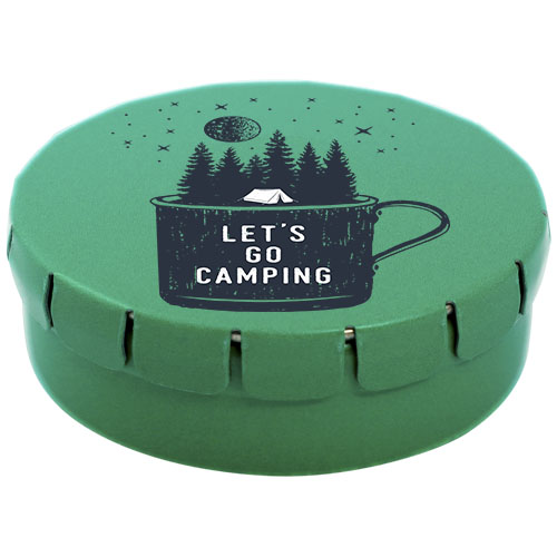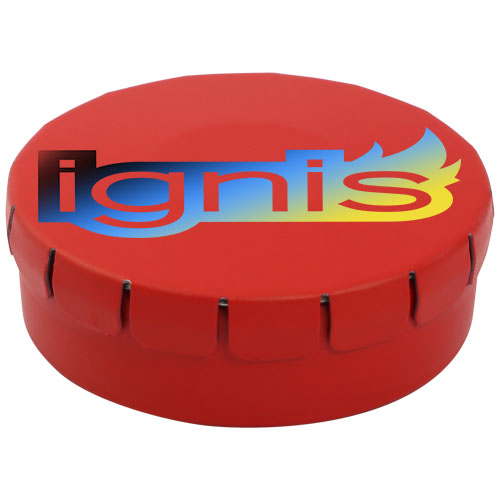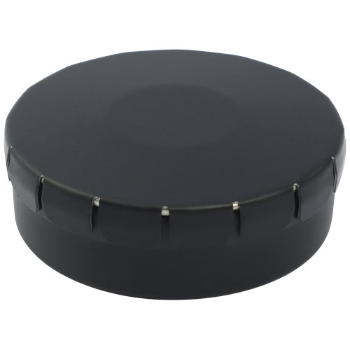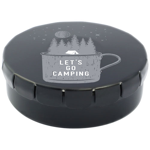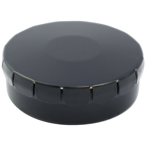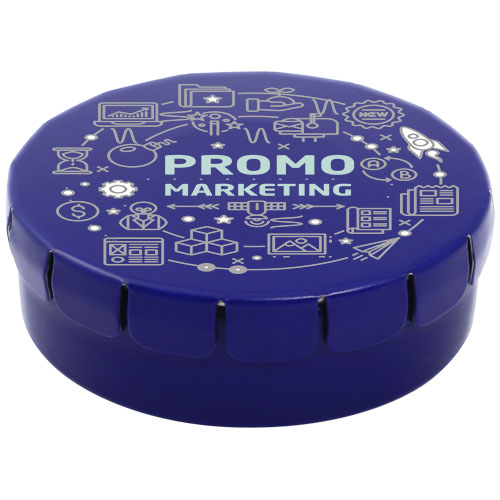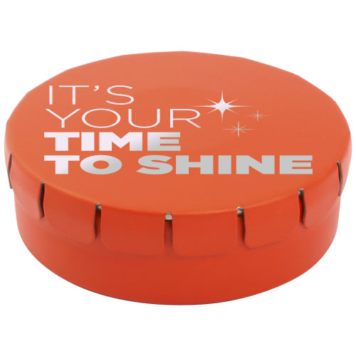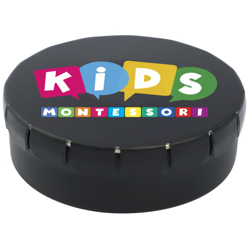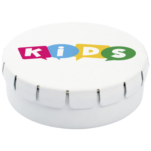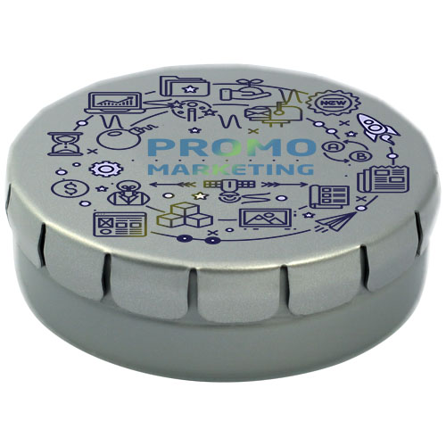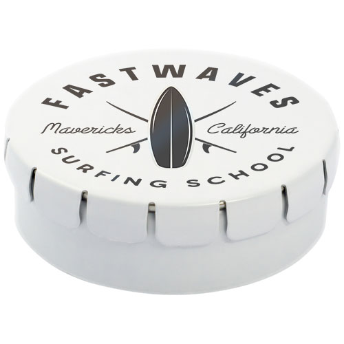 Fruit drops in contenitore di latta con facile apertura a scatto. Il contenitore può essere ordinato in una vasta gamma di colori e riempito con caramelle dai gusti diversi: mentine tradizionali, mentine extra forti, mentine senza zucchero, gelatine di frutta, caramelle a forma di cuore e al gusto fragola, cannella, caramelle al limone e menta o cioccolatini. Il coperchio può essere decorato con una stampa digitale a colori.