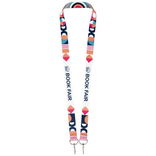 Cordino con stampa in sublimazione full color in PET riciclato e 2 ganci in metallo. Può contenere badge, carte d'identità o chiavi. Disponibile in 4 diverse larghezze: 10, 15, 20 e 25 mm.