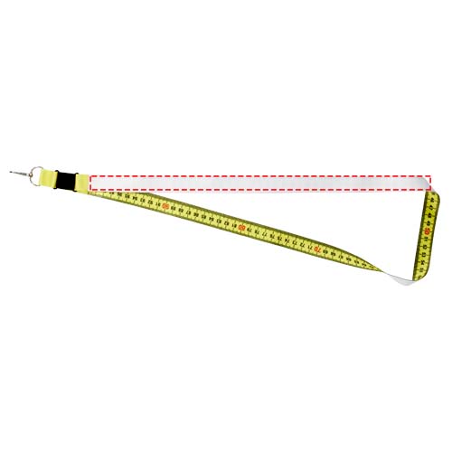 Lanyard da 1 metro con sublimazione full color in PET riciclato. Questo cordino è stampato a colori su un lato, mentre sul retro è presente la stampa di un metro a nastro. Il cordino presenta un gancio metallico e può contenere un badge, la carta d'identità o le chiavi.