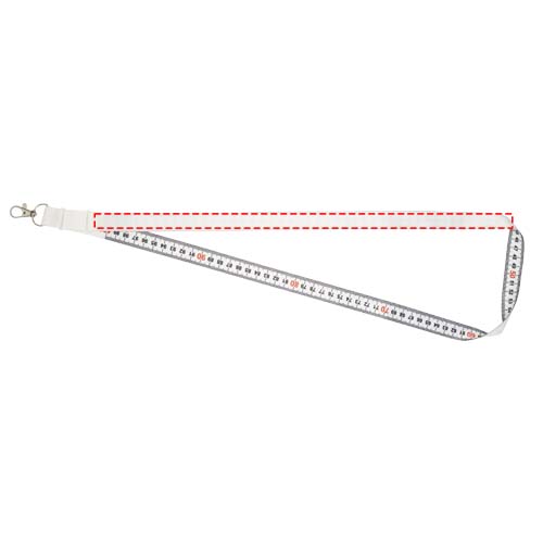Lanyard da 1 metro con sublimazione full color in PET riciclato. Questo cordino è stampato a colori su un lato, mentre sul retro è presente la stampa di un metro a nastro. Il cordino presenta un gancio metallico e può contenere un badge, la carta d'identità o le chiavi.