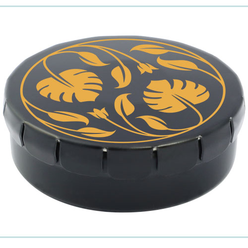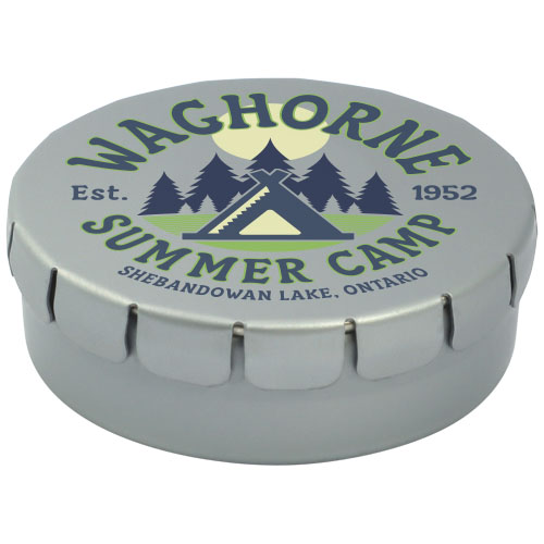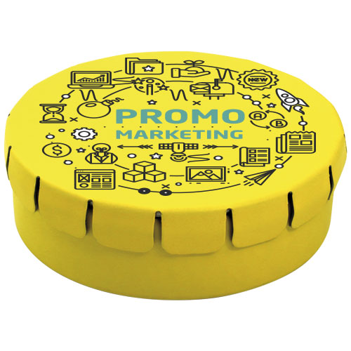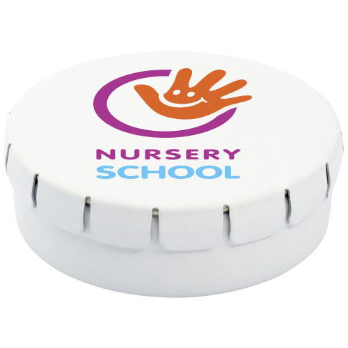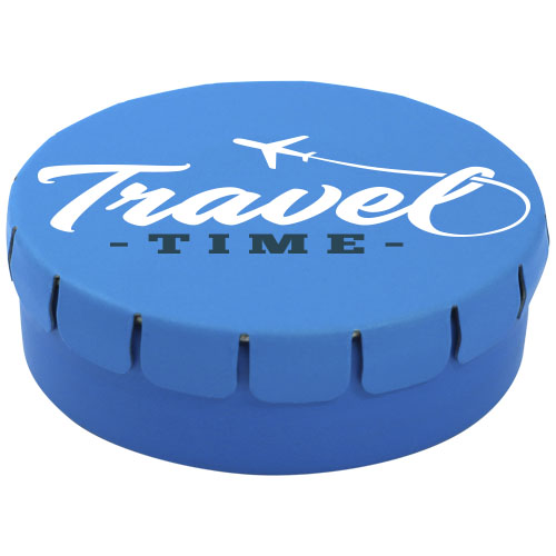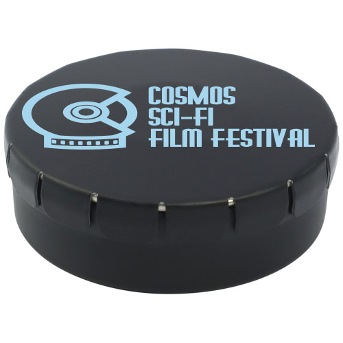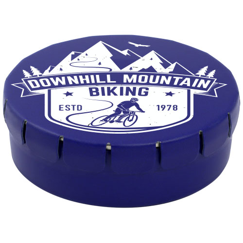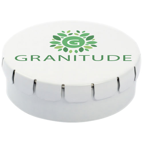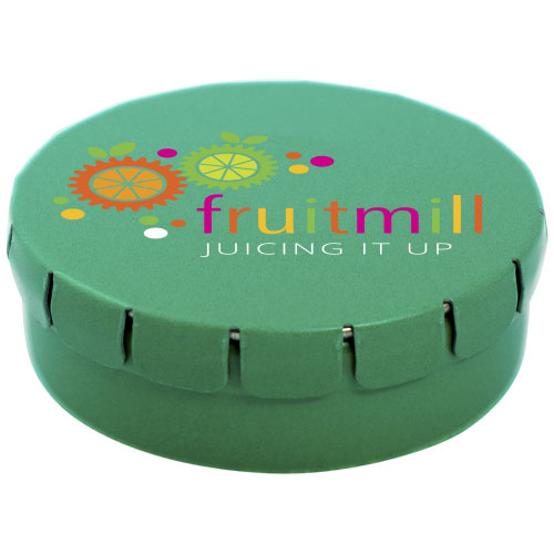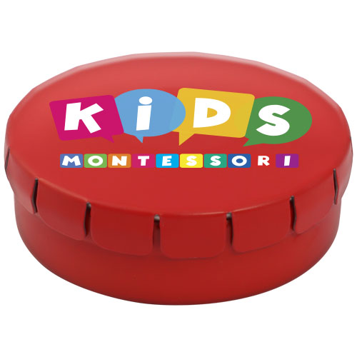 Mentine extra forti in contenitore di latta con facile apertura a scatto. Il contenitore può essere ordinato in una vasta gamma di colori e riempito con caramelle dai gusti diversi: mentine tradizionali, mentine extra forti, mentine senza zucchero, gelatine di frutta, caramelle a forma di cuore e al gusto fragola, cannella, caramelle al limone e menta o cioccolatini. Il coperchio può essere decorato con una stampa digitale a colori.