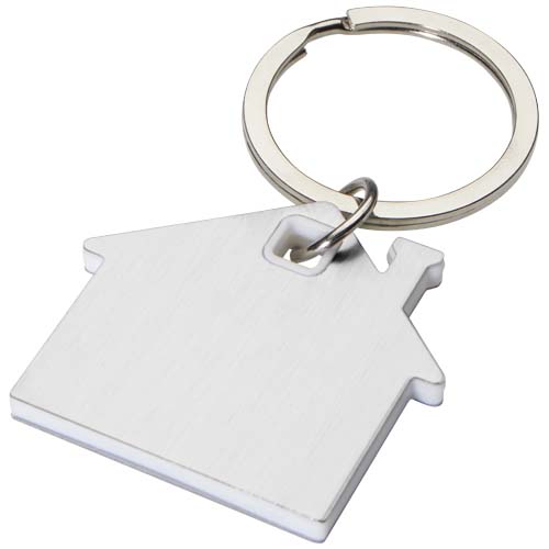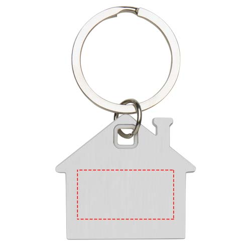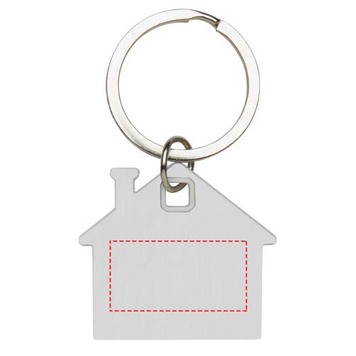 Portachiavi a forma di casa realizzato in una piastra in acciaio inossidabile con design anteriore e posteriore satinato e un chip in plastica colorata al centro.
