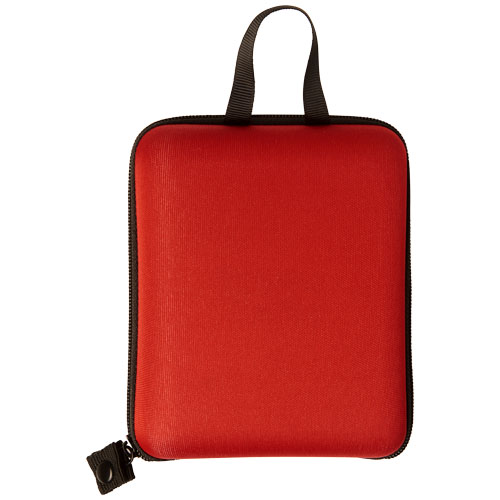 Custodia in EVA contenente 4 tamponi imbevuti con alcol, 1 spugna in tessuto non tessuto, 5 cerotti, 1 rotolo di scotch di carta, 1 benda, un paio di forbici, 2 spille e 1 benda triangolare. Conforme alla normativa EN 13485.