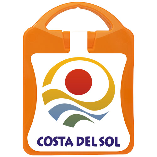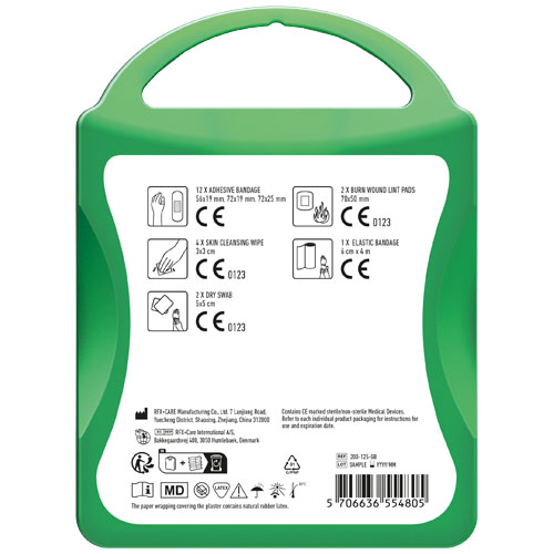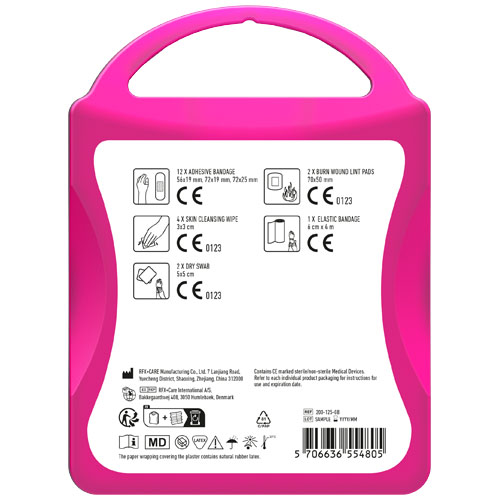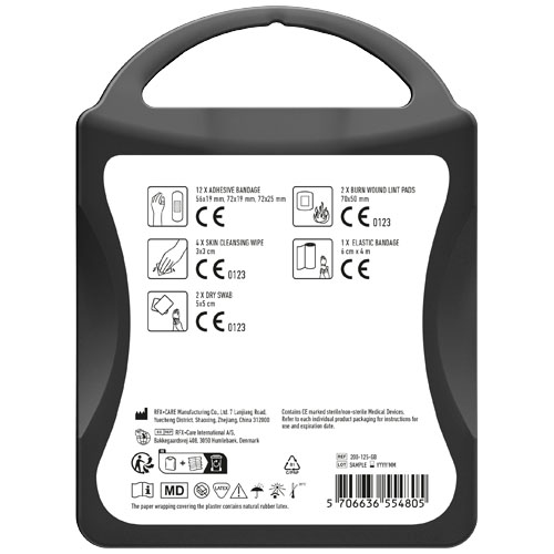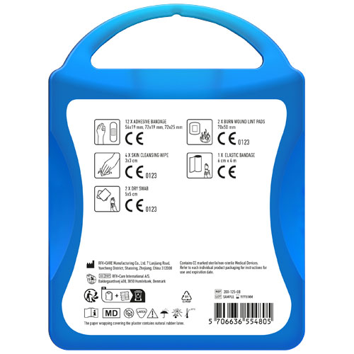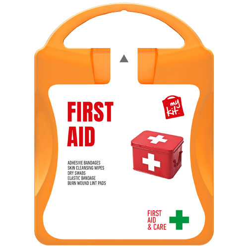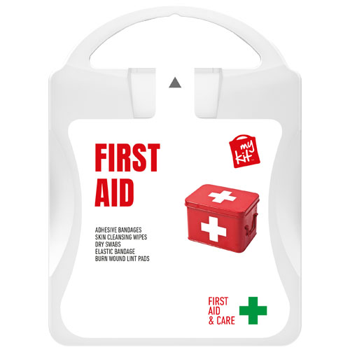 Questo kit di primo soccorso basico è utile a casa o in auto, pronto all'occorrenza per ogni evento. Contenuto: 12 cerotti resistenti all'acqua, 4 salviettine disinfettanti, 2 garze sterili, 1 benda elastica, 2 garze per ustioni. Tutti i prodotti contenuti nei MyKit rispettano le norme Europee vigenti. I prezzi includono stampa all-over fronte e retro.