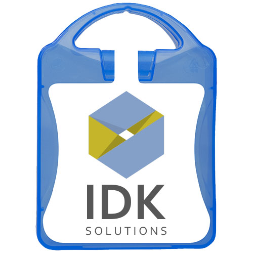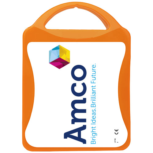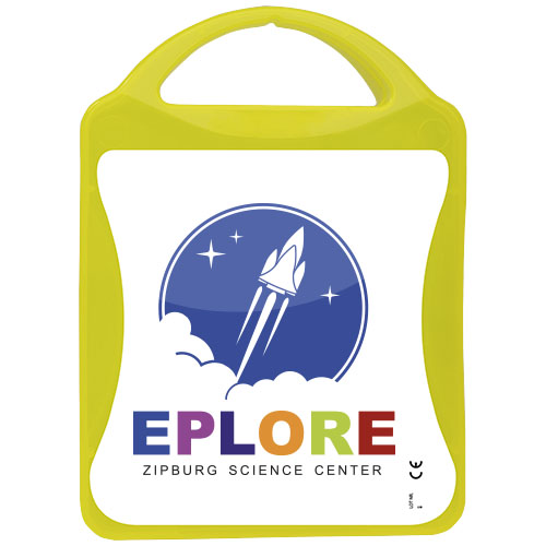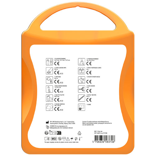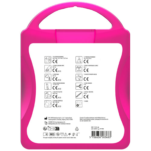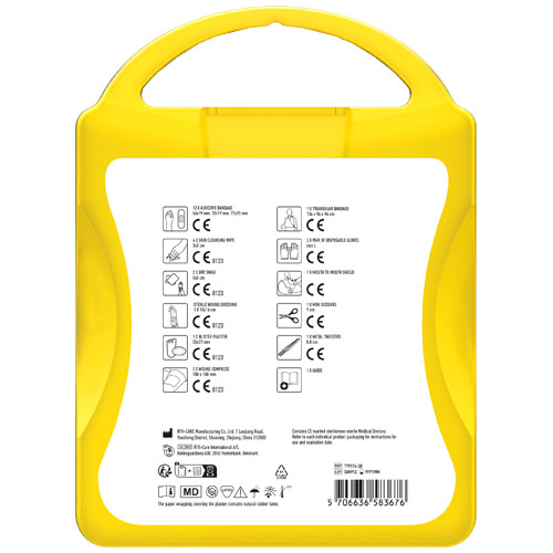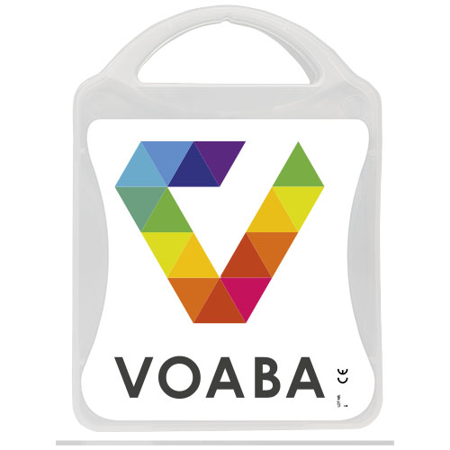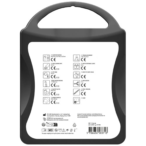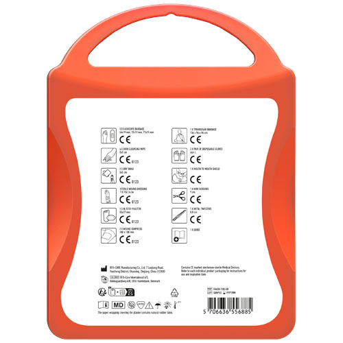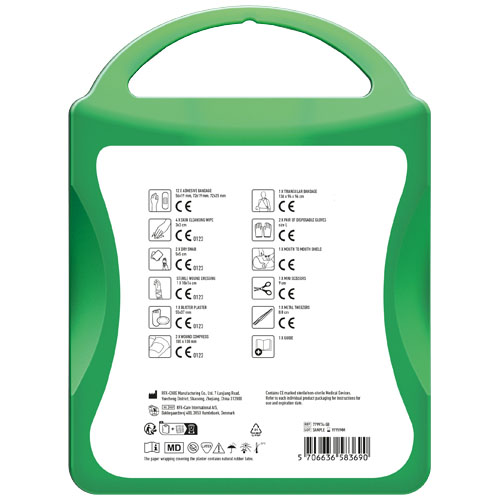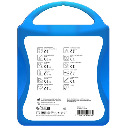This extensive first aid kit is a handy thing to have in your house to be prepared for injuries and emergencies. Contenuto: 1 guida al primo soccorso, 1 cerotto per vesciche, 12 cerotti resistenti all'acqua, 1 pinzetta in metallo, 1 forbice, 1 benda triangolare, 1 paio di guanti monouso, 2 garze per ferite, 1 garza sterile per ferite, 2 garze sterili, 4 salviettine disinfettanti, 1 Kit respirazione bocca a bocca. Tutti i prodotti contenuti nei MyKit rispettano le norme Europee vigenti. I prezzi includono stampa all-over fronte e retro.